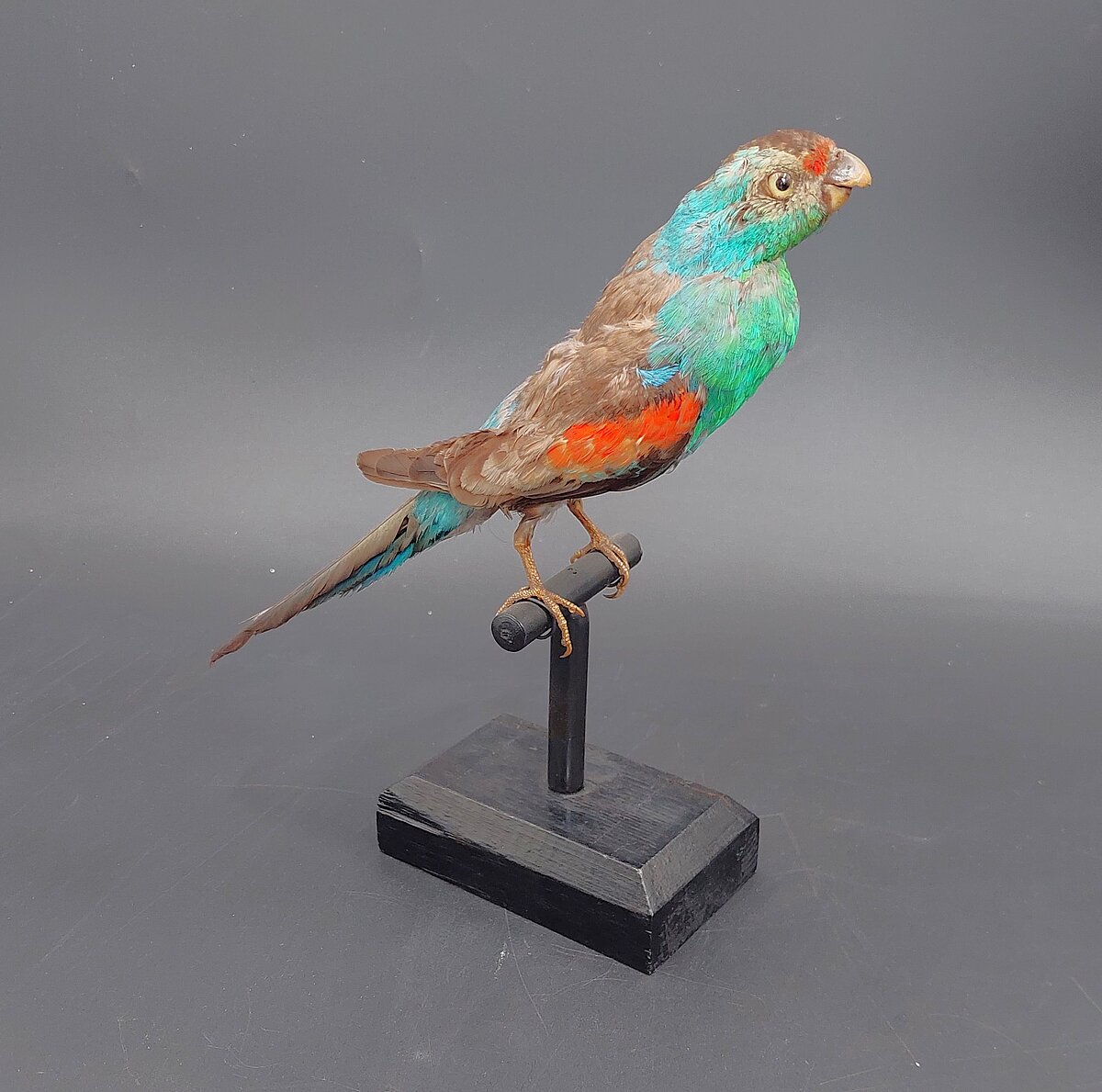 Unikālo Psephotellus pulcherrimus izbāzeni iespējams apskatīt Zooloģijas kolekciju ekspozīcijas vitrīnā kopā ar citiem paradīzes putniem no visas pasaules. Diemžēl ar laiku putna spalvas ir zaudējušas savu košumu, taču tas joprojām sniedz ieskatu, kāds bija šis izmirušais putns.