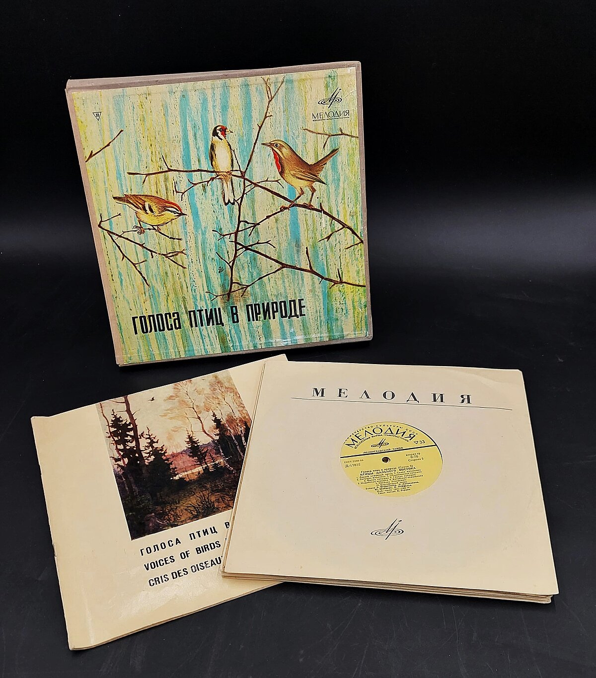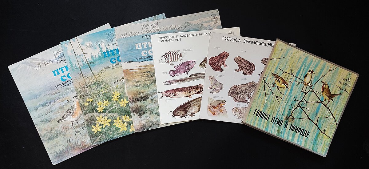Latvijas Universitātes Muzeja Zooloģijas kolekcijās glabājas 11 skaņuplates ar putnu, zivju un abinieku balsu ierakstiem. No tām trīs skaņuplates ir 1982. Gadā izdota sērija ar putnu balsu ierakstiem, ko ierakstījis Boriss Veprincevs. Biofiziķis Boriss Veprincevs (Борис Вепринцев, 1928–1990) bija viens no slavenākajiem padomju ornitologiem, kas nodarbojās ar bioakustiku. Viņš bija ne tikai putnu balsu ierakstītājs, bet arī to kolekcionārs un inventarizācijas veidotājs [1]. Muzejā glabājas arī sešu skaņuplašu komplekts ar putnu balsīm, ko kopā ierakstījuši B. Veprincevs un R. Naumovs (Р. Наумов, 1902-1987). Pieejama viena skaņuplate ar zivju skaņu ierakstiem un viena skaņuplate ar abinieku balsu ierakstiem. Abos gadījumos balsis ierakstījis I. Ņikoļskis (И. Никольский, 1910-1977). Visas skaņuplates izdotas slavenajā PSRS skaņu ierakstu firmā ”Melodija” ("Мелодия"), un tās ir "Melodijas" un PSRS Zinātņu akadēmijas kopprodukts.