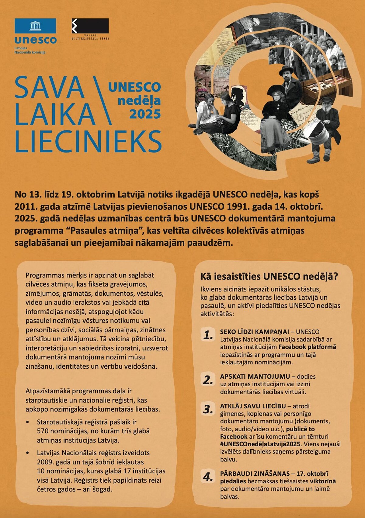 Pievieno nelielu aprakstu, kad liecība tapusi, ar ko tā unikāla un ko atklāj par laikmetu, un tēmturus #UNESCOnedēļaLatvijā2025 un #savalaikaliecinieks.