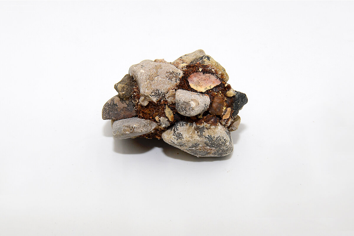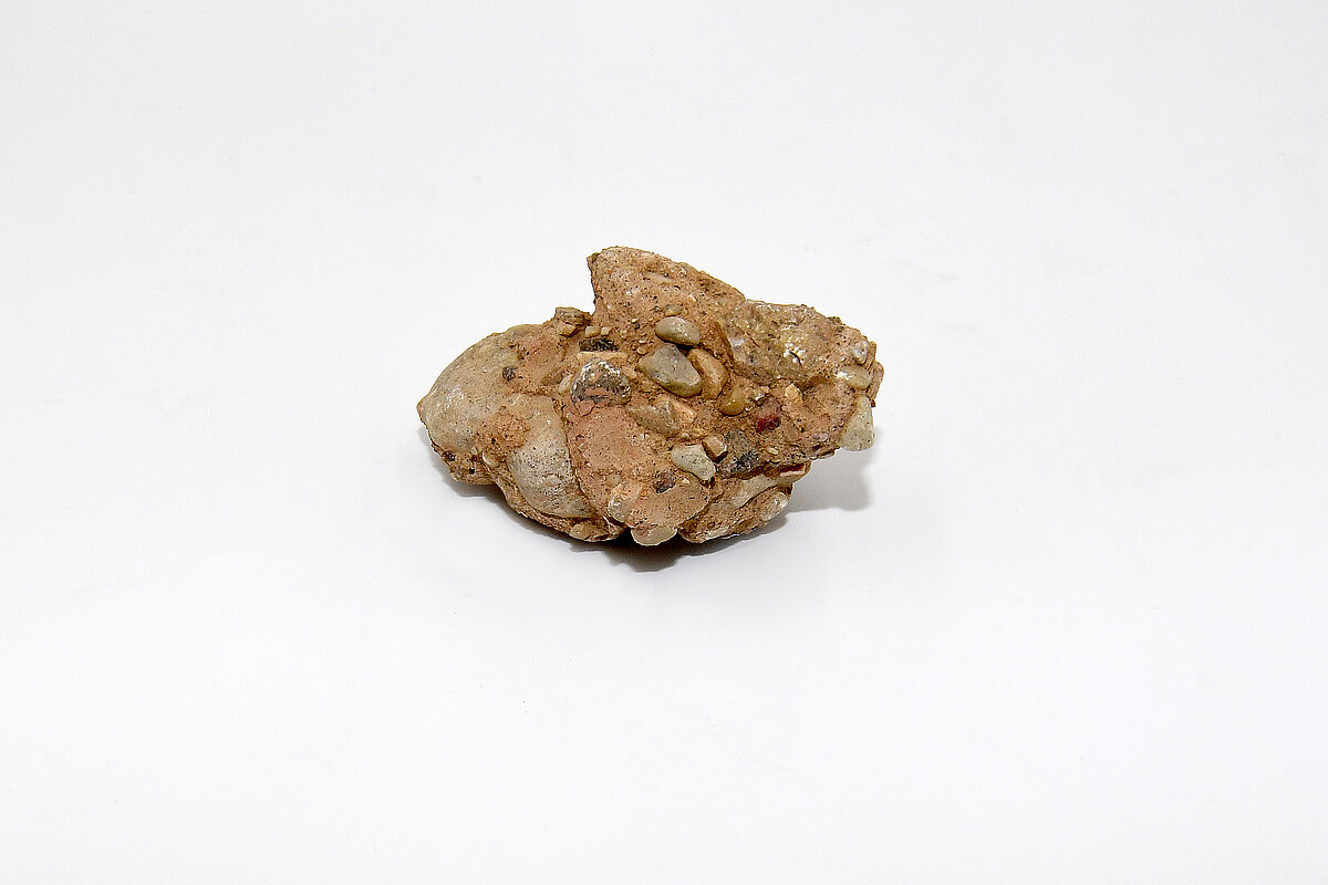 Krājumā ir arī daži savdabīgi, miniatūri konglomerāti, kuros oļi sacementēti ar jau minētajiem dzelzs hidroksīdiem. Vienu no šādiem paraugiem - ar dzelzs hidroksīdiem sacementētus karbonātiežu oļus, kuru virsmu klāj mangāna minerālu kristāli, ievākusi LU Muzeja eksperte Vija Hodireva, un tas apskatīts 2024. gadā izdotajā V. Hodirevas monogrāfijā “Latvijas kristāli” [2]. Otru 2015. gadā ievākuši LU ĢZZF studenti, tā ievākšanas vieta skaidri nav zināma (norādīts smilts/grants karjers), bet, spriežot pēc citiem krājumā esošiem šādiem atsevišķiem oļiem, tas varētu būt ievākts Medņu grants karjerā, Laidzu karjerā vai Brežģa kalna karjerā. To veidojošo oļu sastāvs ir sekojošs – kaļķakmens oļi (lielākā no tiem izmēri – 4 x 3,5 x 2 cm, pārējo oļu izmēri aptuveni no 1 x 1 x 1 līdz 2 x 2 x 3 cm), daži rozā, pelēkas krāsas magmatisko iežu/iespējams, metamorfo iežu oļi, kuru izmēri aptuveni 1 x 1 x 1 cm, šī konglomerāta sastāvā raksturīgi arī kaļķakmens, rozā krāsas magmatisko iežu grants graudi, kuru izmēri mazāki par 1 x 1 x 1 cm, un cementējošā viela tajā ir smalkas frakcijas, rūsgani brūnas krāsas dzelzs hidroksīdi.