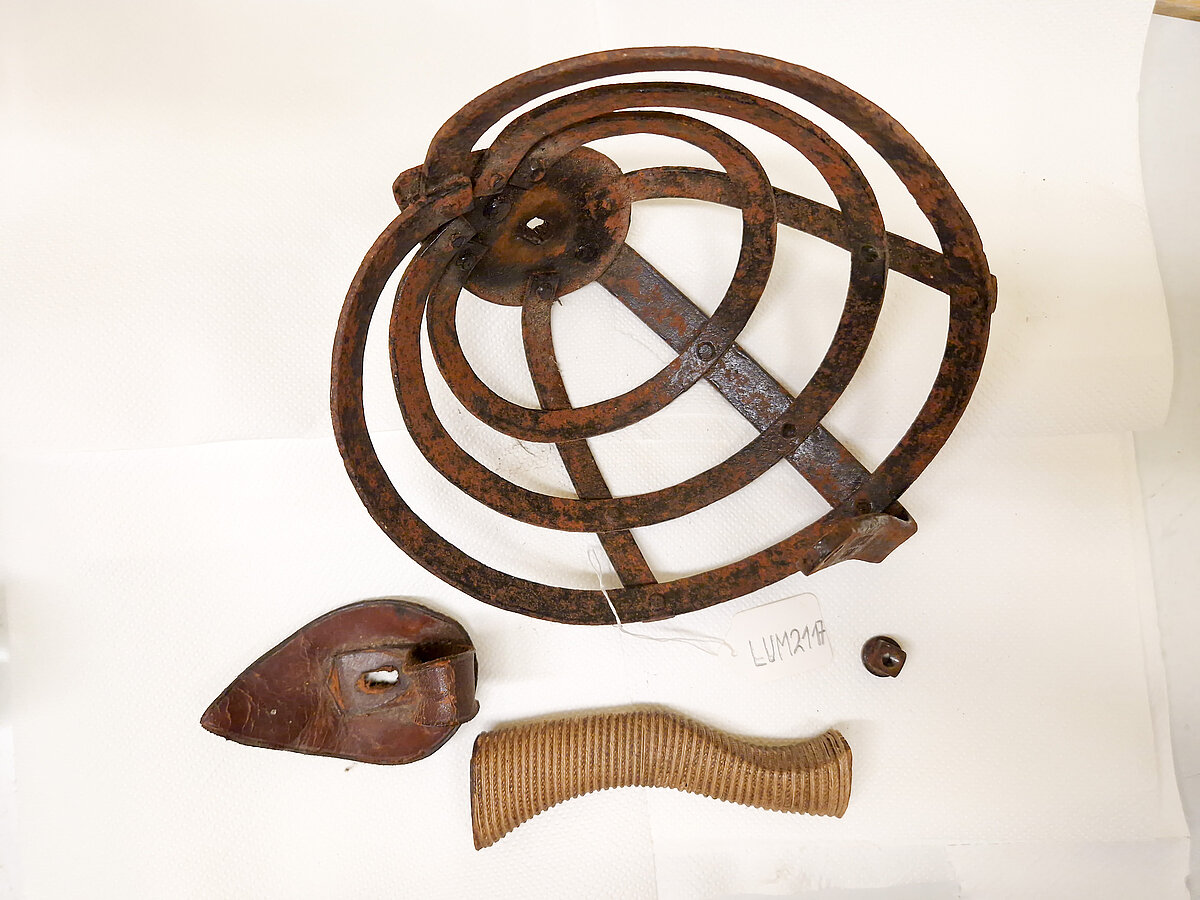Rapieru saglabātības stāvoklis pirms saglabāšanas darbu veikšanas bija samērā slikts, par to norāda korozijas klātbūtne uz metāla daļām, kas pilnībā klāj rapieru asmeņus un daļēji arī kurvjus (2. - 3. att.). Korozijas neskartās metāla daļas klātas ar melnu eļļas krāsu. Vispirms tika veikta priekšmetu tīrīšana un atputekļošana, lai virsmu atbrīvotu no netīrumu, putekļu un iespēju robežās no baltiem punktveida traipiem. Tā kā rapieri ir heterogēni, t.i. sastāv no dažādiem materiāliem (metāla, koka, ādas un tekstila), lai sekmīgāk veiktu to saglabāšanas darbus, bija nepieciešamība tos maksimāli demontēt. Tas ir ļoti būtiski, jo dažādiem materiāliem ir nepieciešama atšķirīga pieeja to saglabāšanā. Katrs no rapieriem tika demontēts piecās daļās (14. att.).